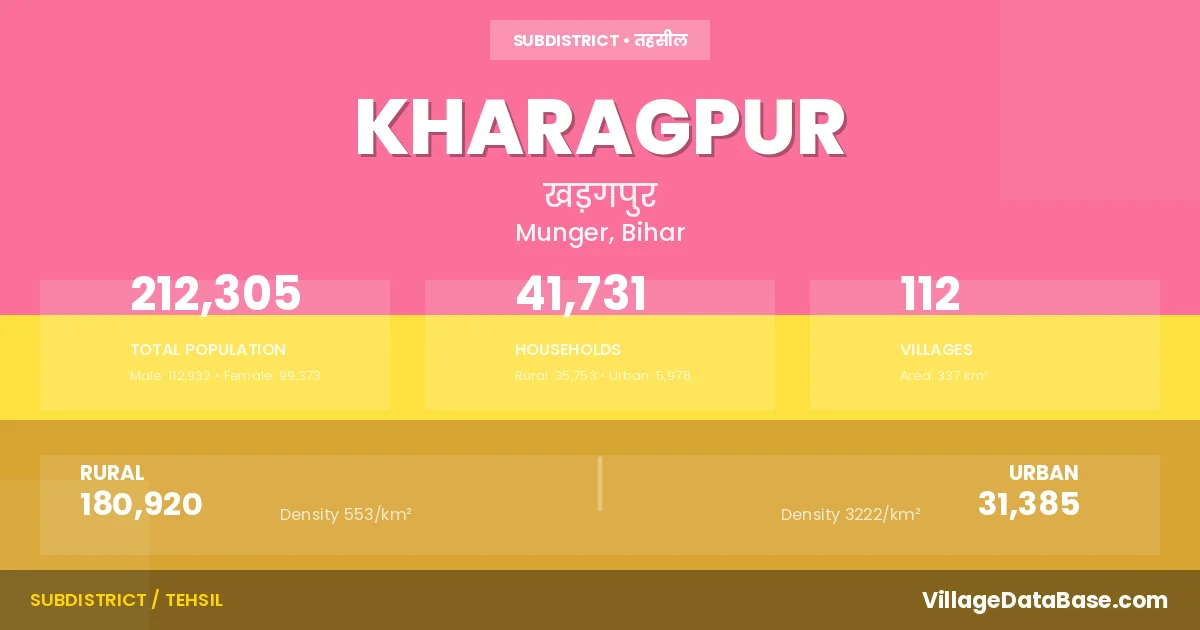 According to the 2011 census The total area of Kharagpur Subdivision is 337 km², with a population of 212305 people. The population density is 630 inhabitants per square kilometre, and there are approximately 41731 houses in the sub district.