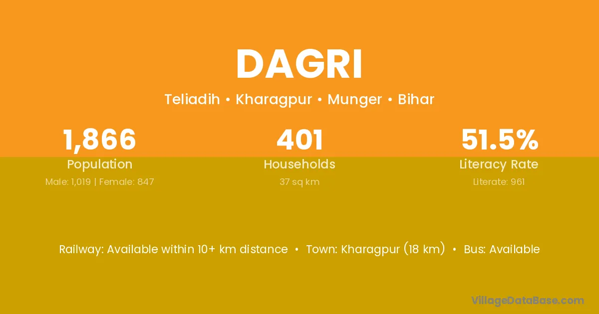 Kharagpur (18 km) is the nearest town to Dagri village for major economic activities and is located approximately 18 km away.
