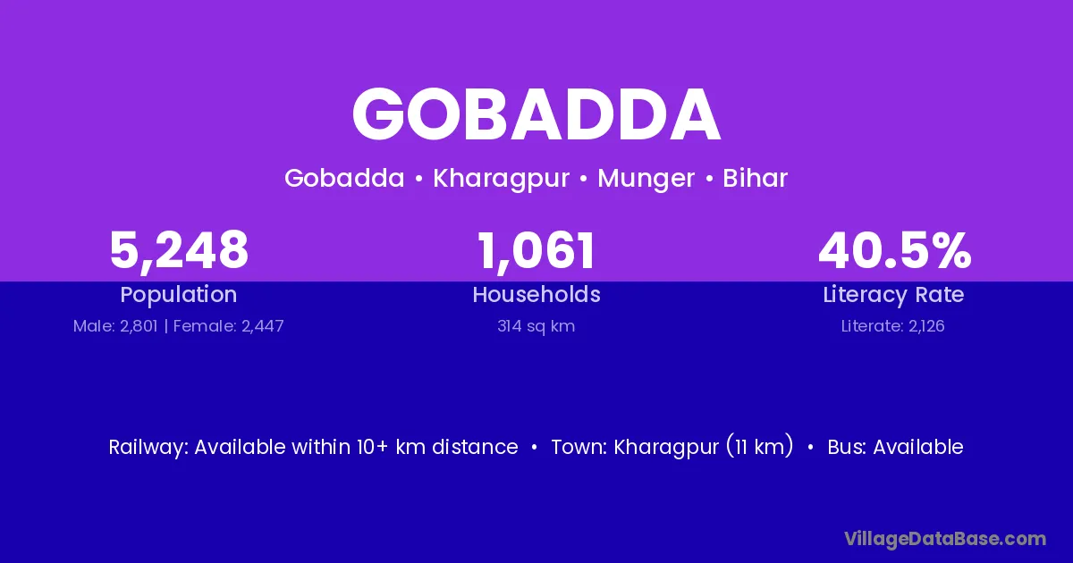Kharagpur (11 km) is the nearest town to Gobadda village for major economic activities and is located approximately 11 km away.