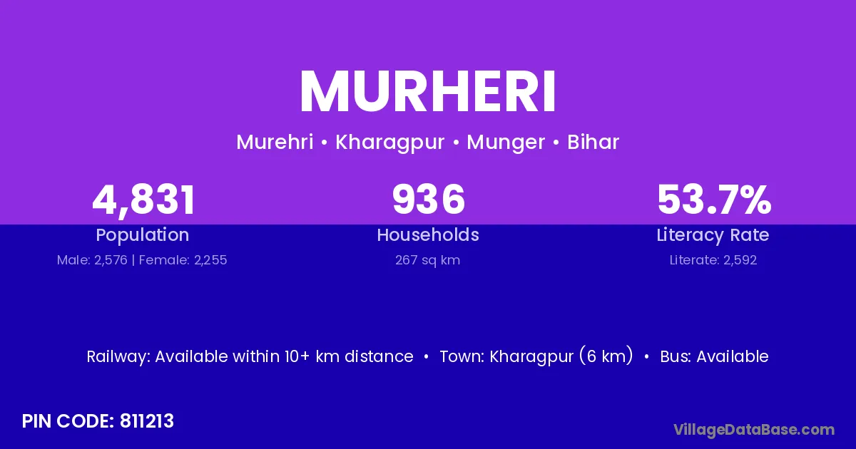 Kharagpur (6 km) is the nearest town to Murheri village for major economic activities and is located approximately 6 km away.
