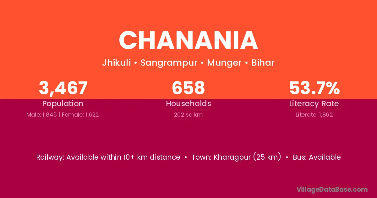 Kharagpur (25 km) is the nearest town to Chanania village for major economic activities and is located approximately 25 km away.