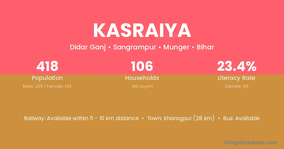 Kharagpur (28 km) is the nearest town to Kasraiya village for major economic activities and is located approximately 28 km away.