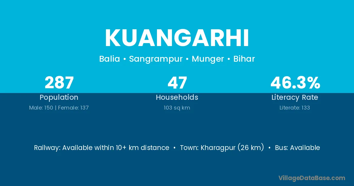 Kharagpur (26 km) is the nearest town to Kuangarhi village for major economic activities and is located approximately 26 km away.