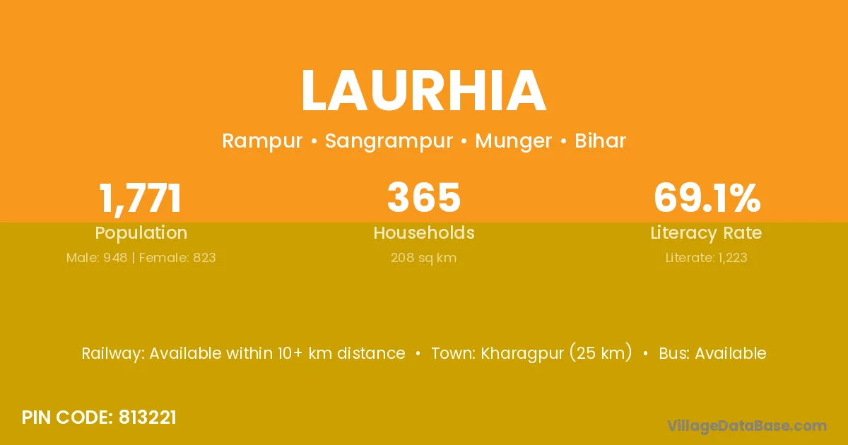 Kharagpur (25 km) is the nearest town to Laurhia village for major economic activities and is located approximately 25 km away.