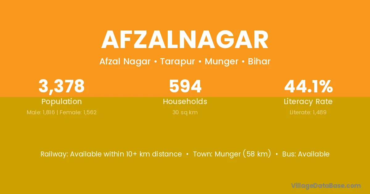 Munger (58 km) is the nearest town to Afzalnagar village for major economic activities and is located approximately 58 km away.