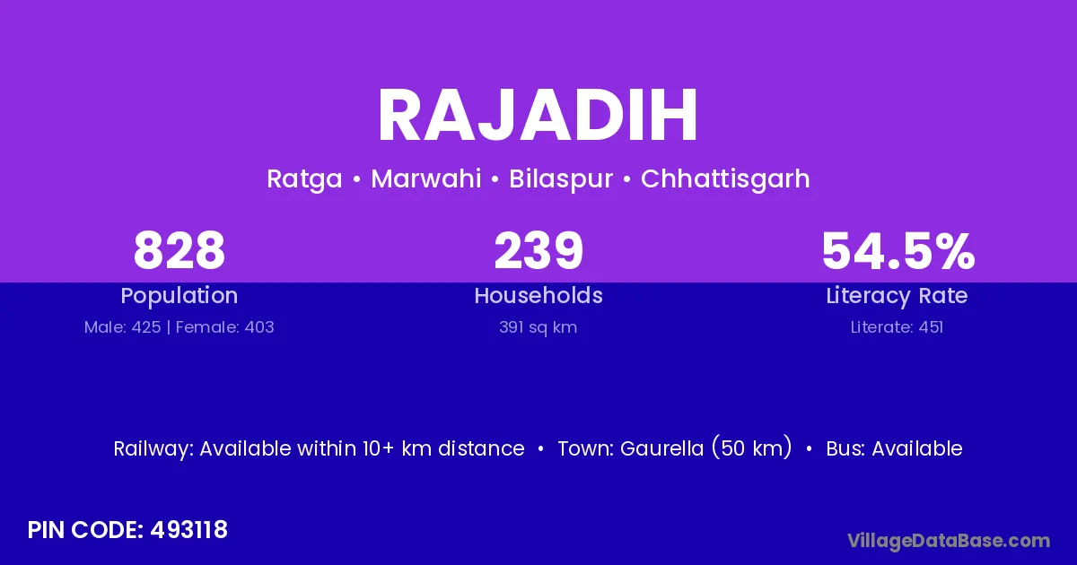 Rajadih village has a total population of 1,843 people, of which 979 are males and 864 are females.