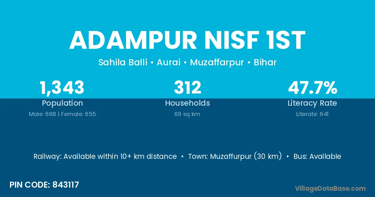 Muzaffurpur (30 km) is the nearest town to Adampur Nisf 1st village for major economic activities and is located approximately 30 km away.