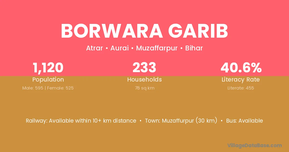 Muzaffurpur (30 km) is the nearest town to Borwara Garib village for major economic activities and is located approximately 30 km away.