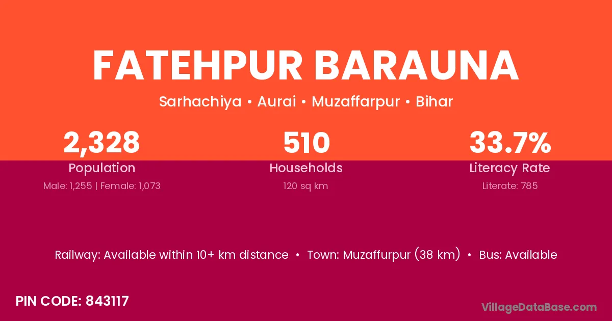 Muzaffurpur (38 km) is the nearest town to Fatehpur Barauna village for major economic activities and is located approximately 38 km away.