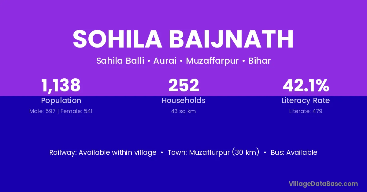 Muzaffurpur (30 km) is the nearest town to Sohila Baijnath village for major economic activities and is located approximately 30 km away.