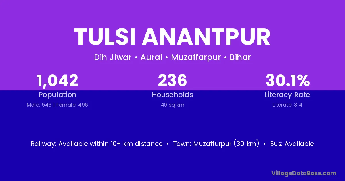 Muzaffurpur (30 km) is the nearest town to Tulsi Anantpur village for major economic activities and is located approximately 30 km away.