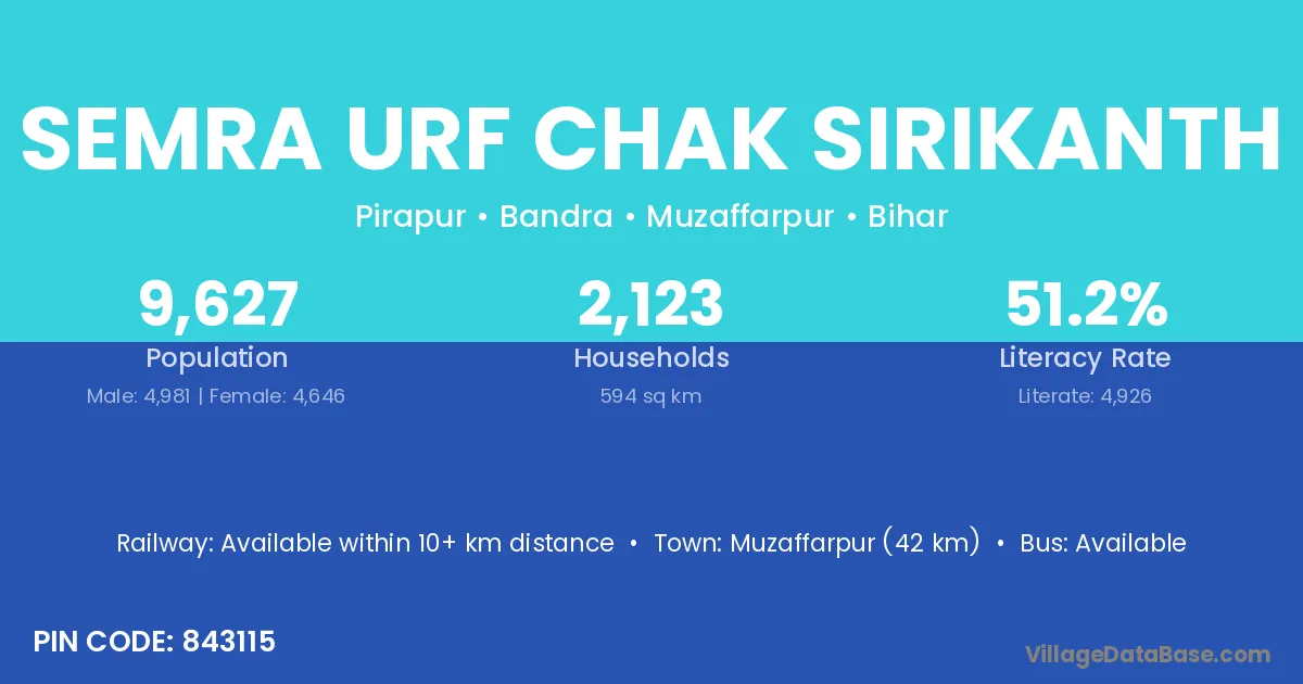 Semra Urf Chak Sirikanth village has a total population of 9,627 people, of which 4,981 are males and 4,646 are females.