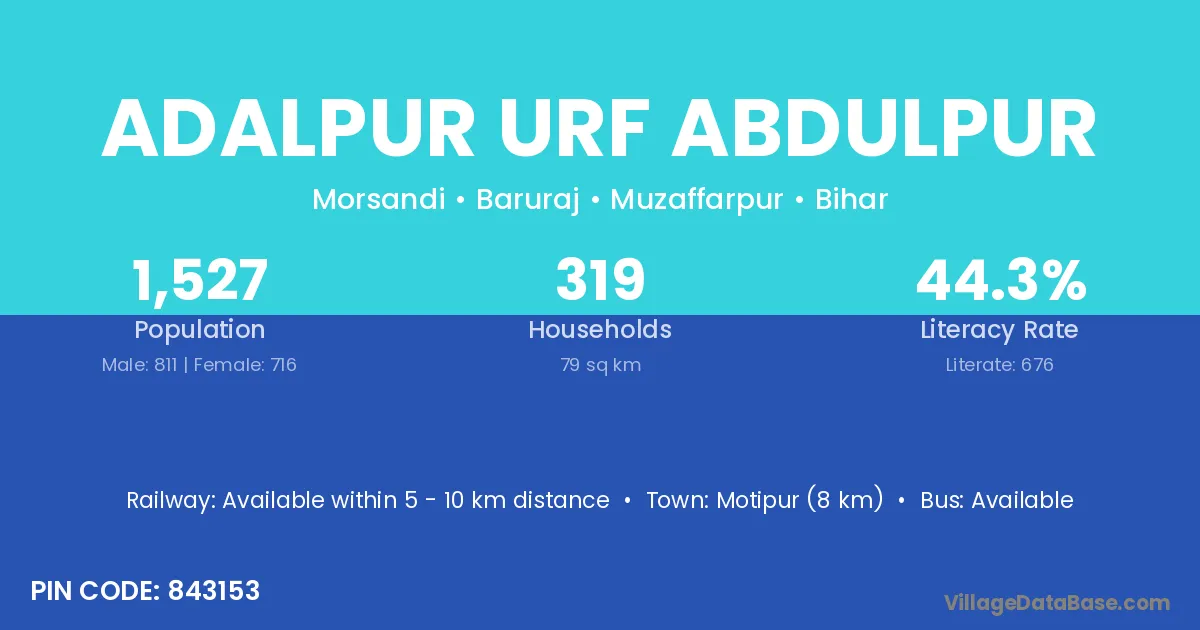 Motipur (8 km) is the nearest town to Adalpur Urf Abdulpur village for major economic activities and is located approximately 8 km away.