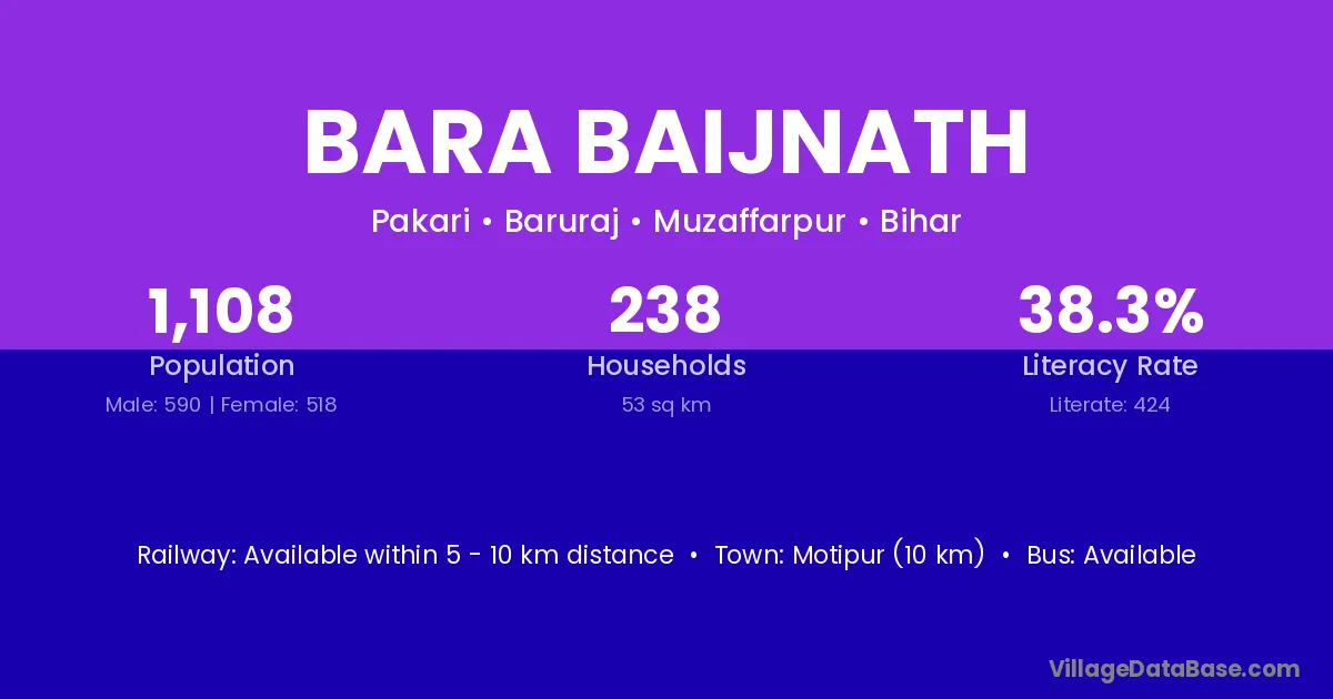 Motipur (10 km) is the nearest town to Bara Baijnath village for major economic activities and is located approximately 10 km away.
