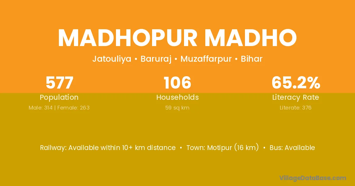 Motipur (16 km) is the nearest town to Madhopur Madho village for major economic activities and is located approximately 16 km away.