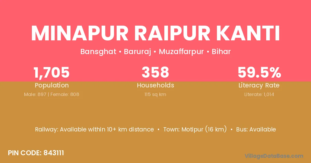 Motipur (16 km) is the nearest town to Minapur Raipur Kanti village for major economic activities and is located approximately 16 km away.