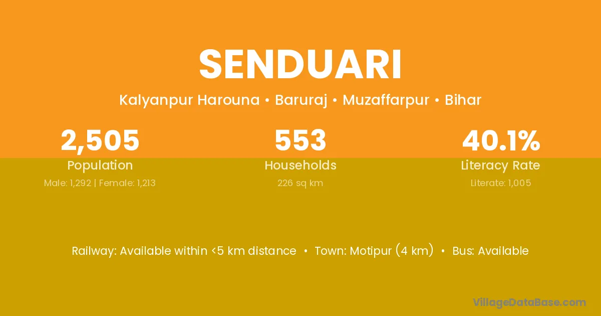 Motipur (4 km) is the nearest town to Senduari village for major economic activities and is located approximately 4 km away.