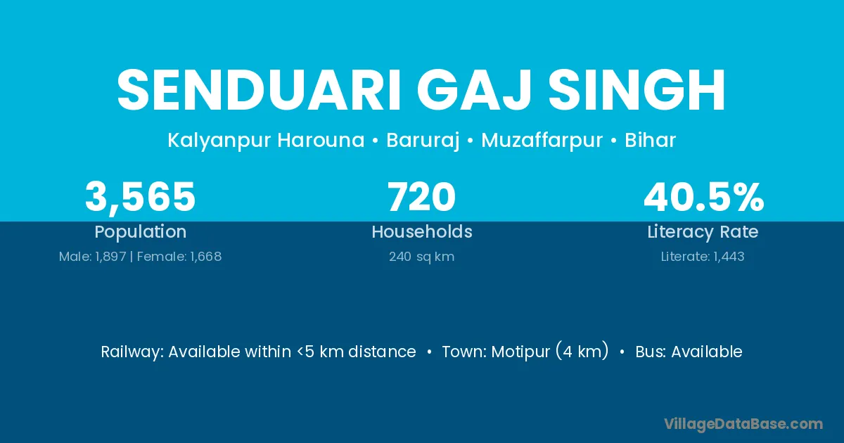Motipur (4 km) is the nearest town to Senduari Gaj Singh village for major economic activities and is located approximately 4 km away.