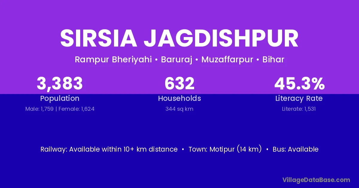Motipur (14 km) is the nearest town to Sirsia Jagdishpur village for major economic activities and is located approximately 14 km away.