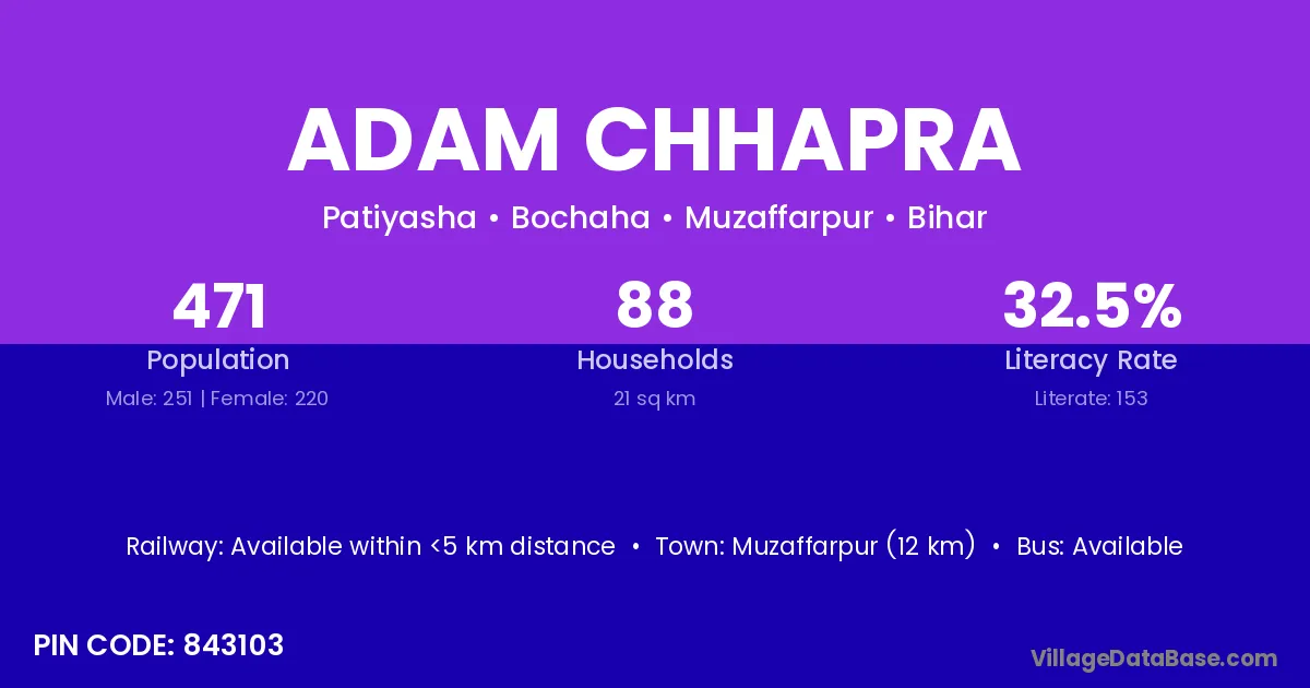 Muzaffarpur (12 km) is the nearest town to Adam Chhapra village for major economic activities and is located approximately 12 km away.