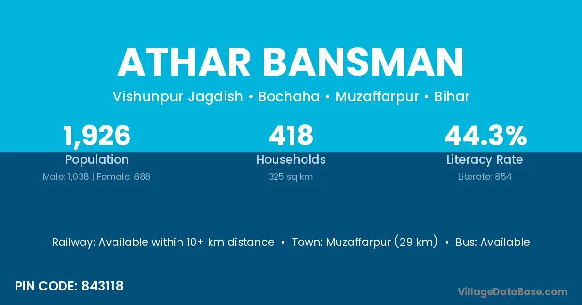 Muzaffarpur (29 km) is the nearest town to Athar Bansman village for major economic activities and is located approximately 29 km away.