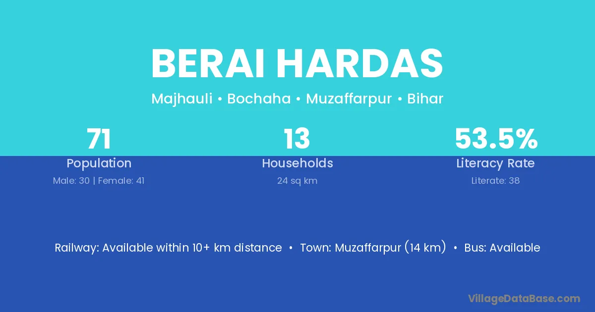 Muzaffarpur (14 km) is the nearest town to Berai Hardas village for major economic activities and is located approximately 14 km away.
