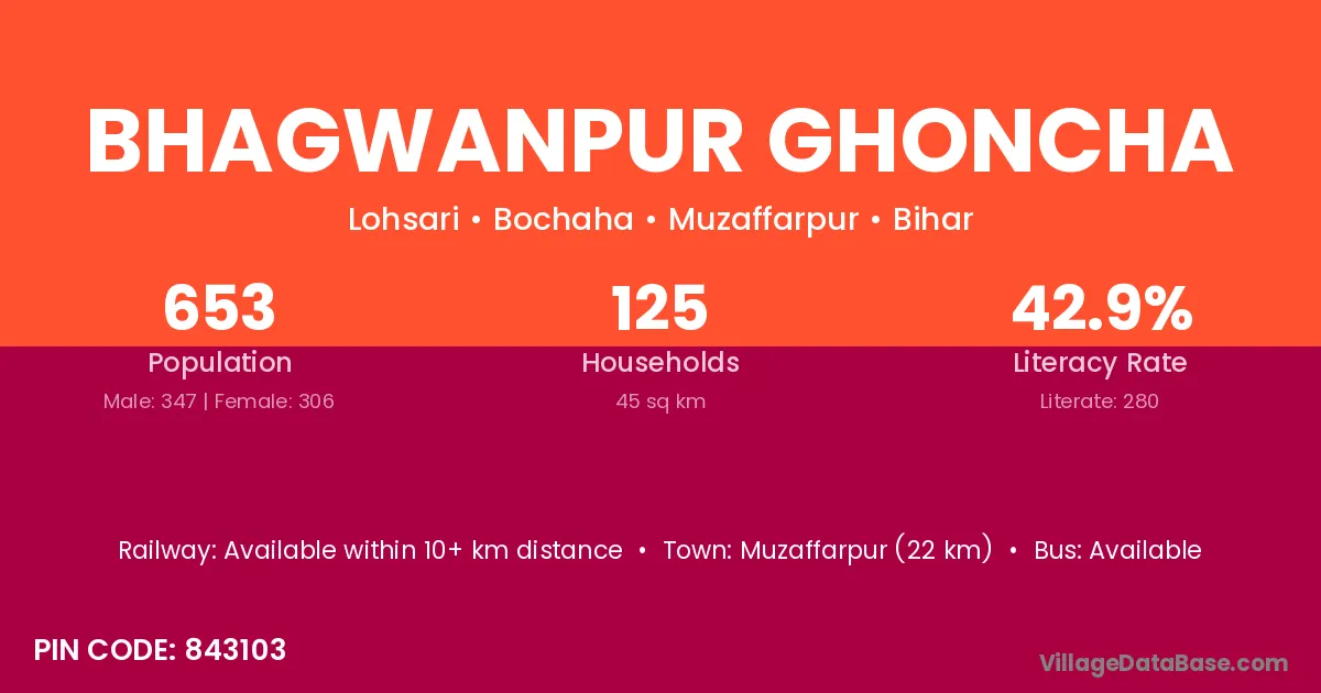 Muzaffarpur (22 km) is the nearest town to Bhagwanpur Ghoncha village for major economic activities and is located approximately 22 km away.