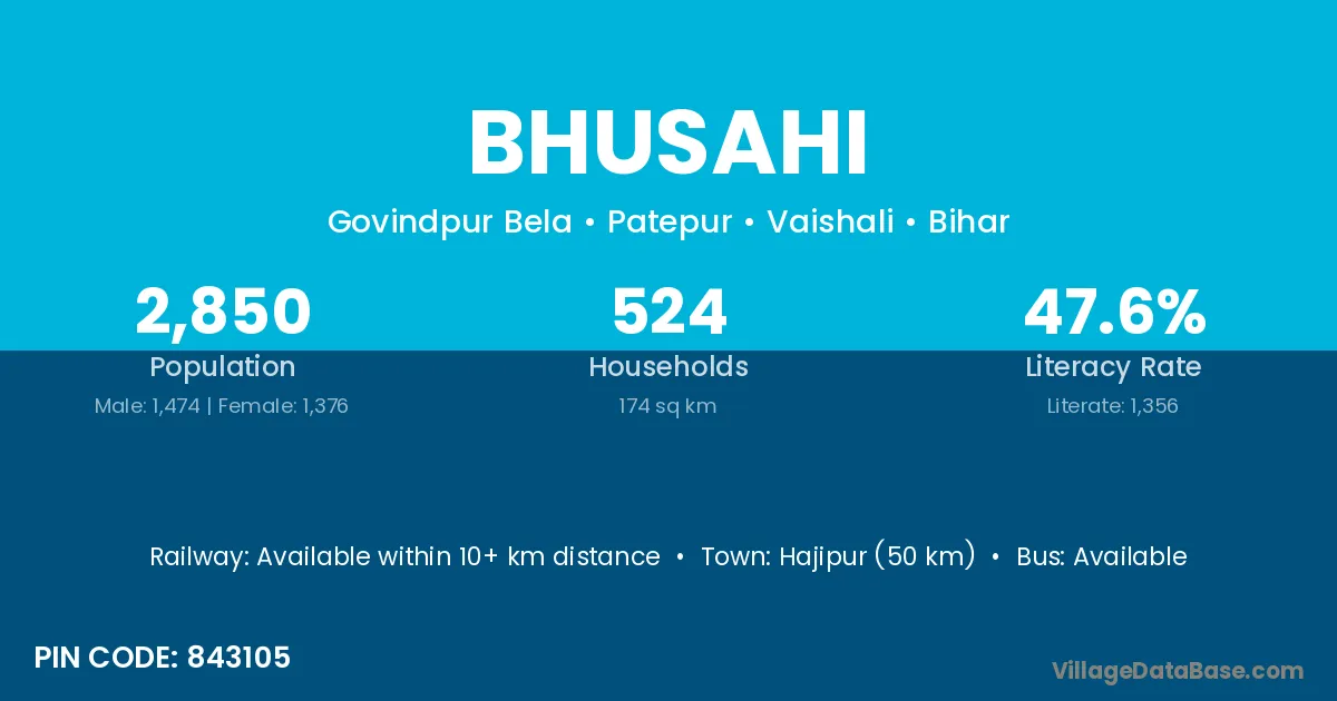 Muzaffarpur (18 km) is the nearest town to Bhusahi village for major economic activities and is located approximately 18 km away.