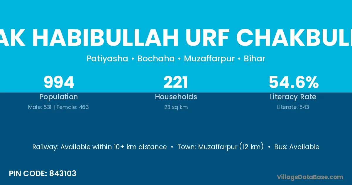 Muzaffarpur (12 km) is the nearest town to Chak Habibullah Urf Chakbullah village for major economic activities and is located approximately 12 km away.