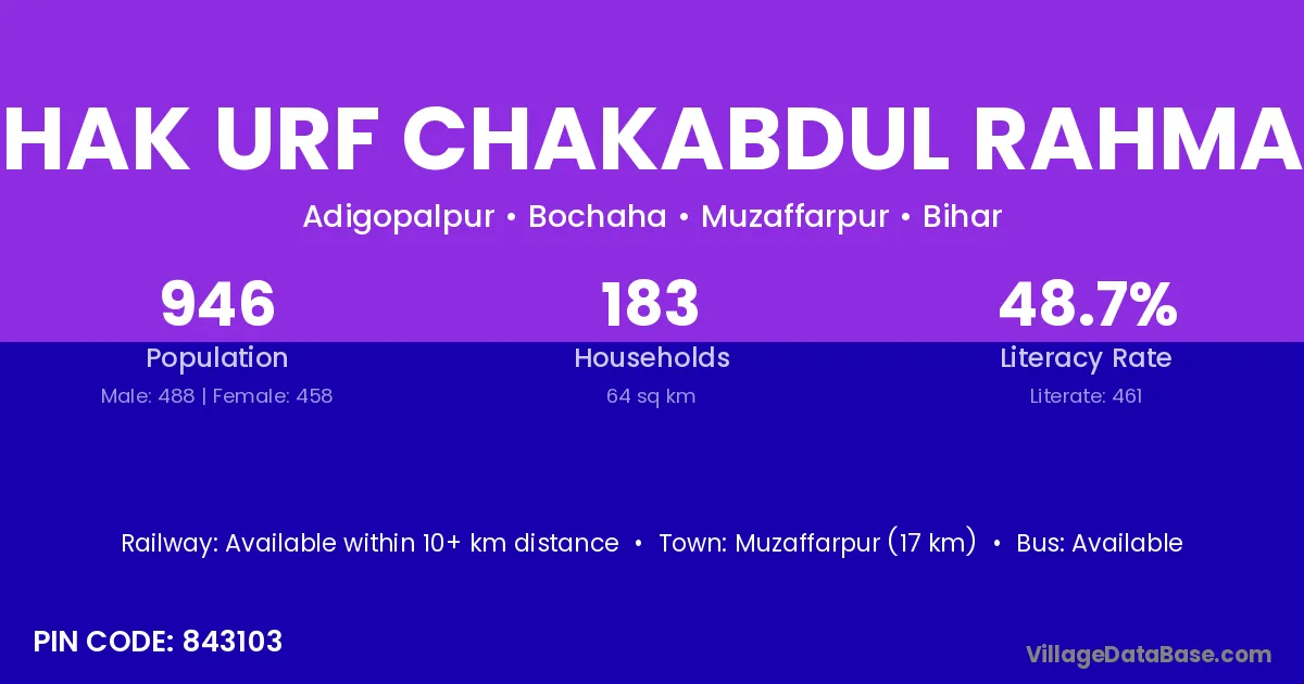 Chak Urf Chakabdul Rahman village is located in the Bochaha Subdivision of the Muzaffarpur district in Bihar .