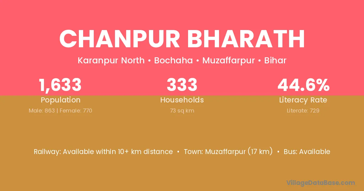 Muzaffarpur (17 km) is the nearest town to Chanpur Bharath village for major economic activities and is located approximately 17 km away.