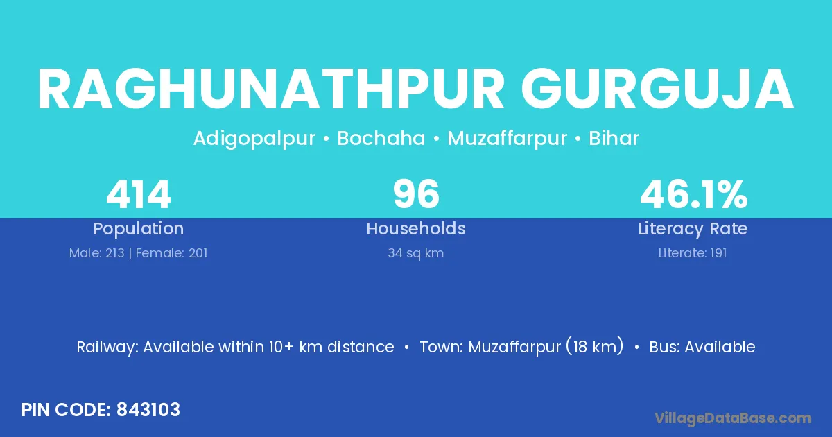 Muzaffarpur (18 km) is the nearest town to Raghunathpur Gurguja village for major economic activities and is located approximately 18 km away.