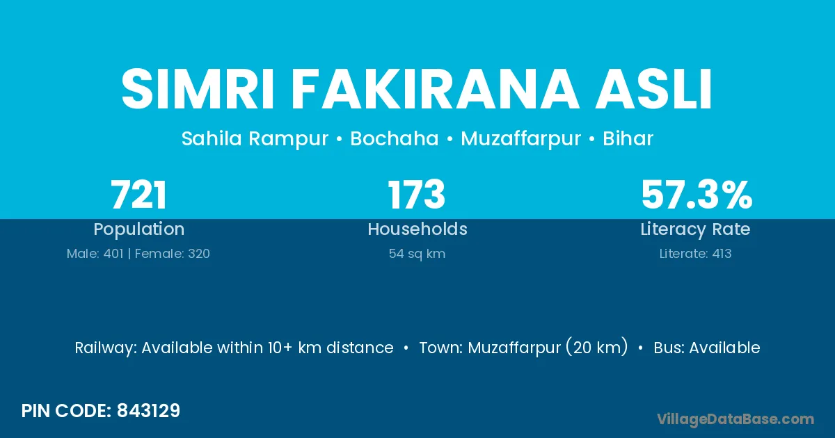 Simri Fakirana Asli village has a total population of 721 people, of which 401 are males and 320 are females.