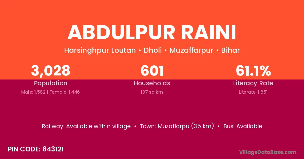 Muzaffarpu (35 km) is the nearest town to Abdulpur Raini village for major economic activities and is located approximately 35 km away.