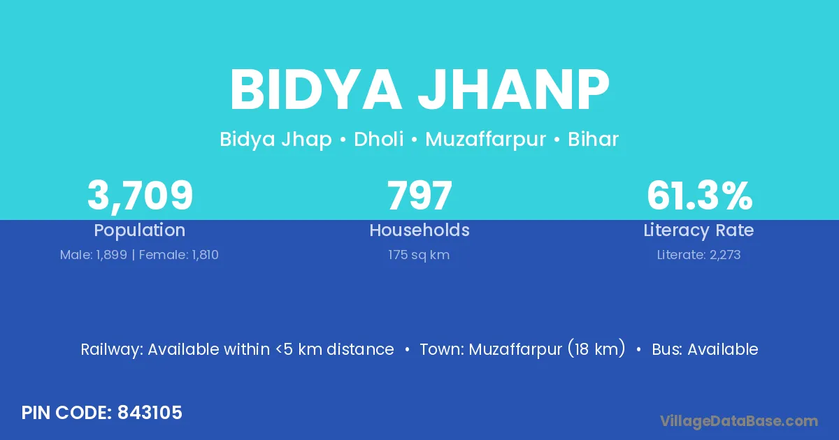 Muzaffarpur (18 km) is the nearest town to Bidya Jhanp village for major economic activities and is located approximately 18 km away.
