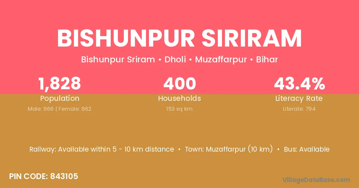 Bishunpur Siriram village has a total population of 1,828 people, of which 966 are males and 862 are females.