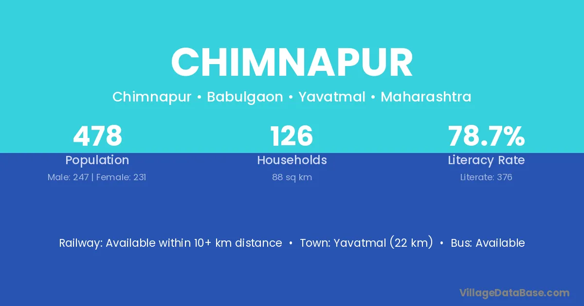 The literacy rate of Chimnapur village is 78.95%. Male literacy stands at 84.62% and female literacy at 72.97%.