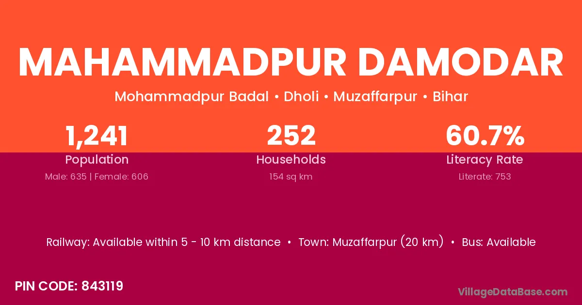 Muzaffarpur (20 km) is the nearest town to Mahammadpur Damodar village for major economic activities and is located approximately 20 km away.