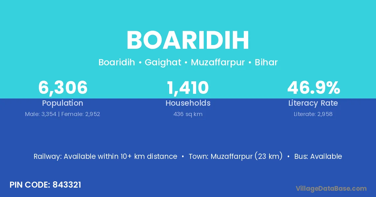 Muzaffarpur (23 km) is the nearest town to Boaridih village for major economic activities and is located approximately 23 km away.