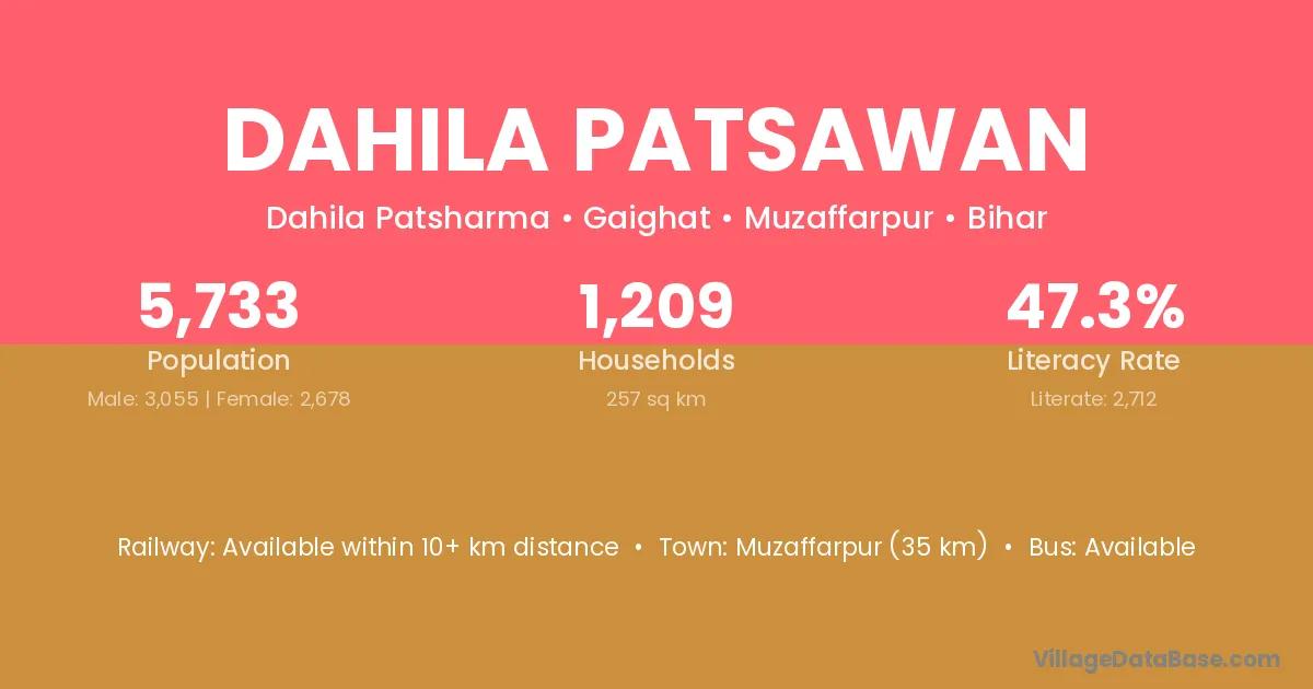 Muzaffarpur (35 km) is the nearest town to Dahila Patsawan village for major economic activities and is located approximately 35 km away.