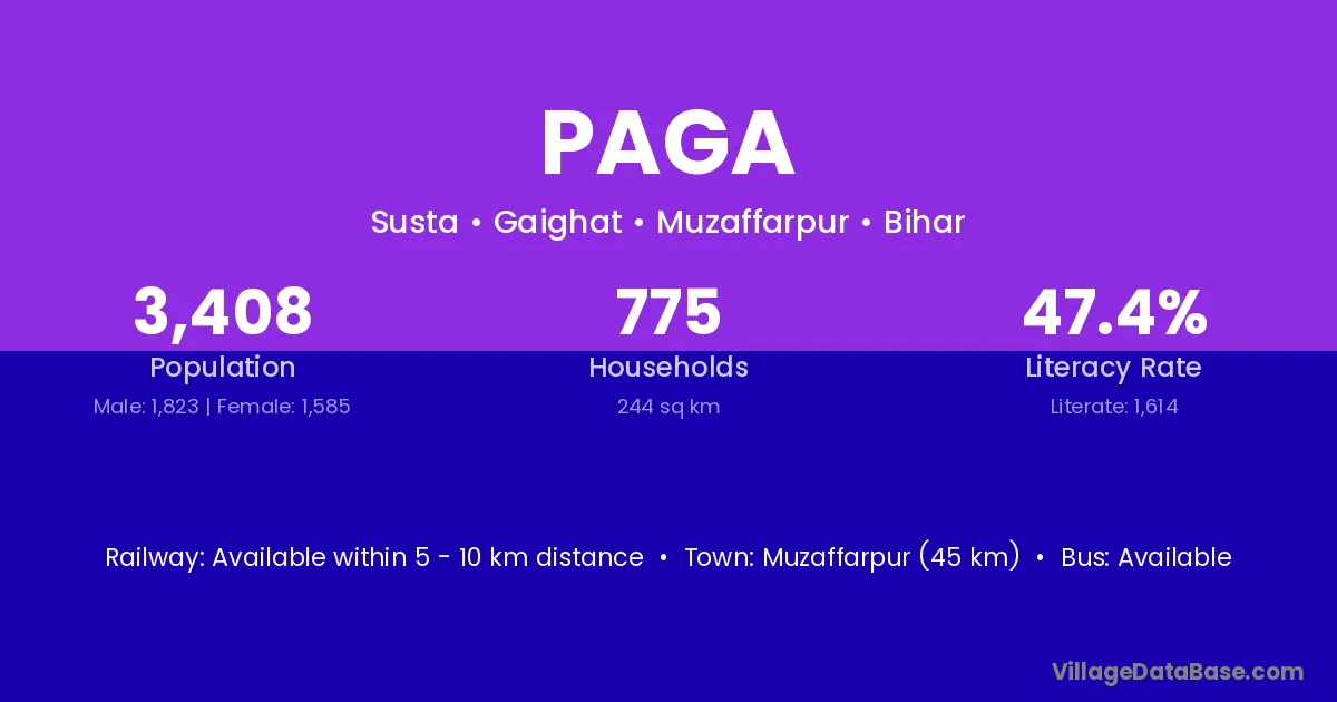 Muzaffarpur (45 km) is the nearest town to Paga village for major economic activities and is located approximately 45 km away.