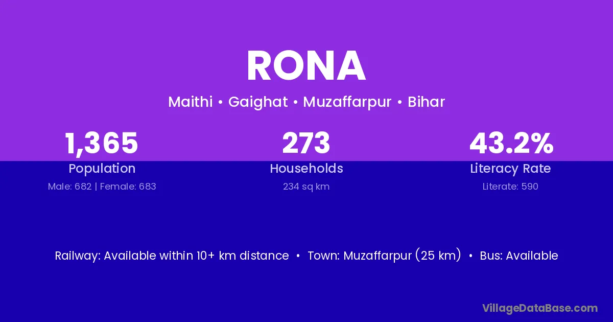 Muzaffarpur (25 km) is the nearest town to Rona village for major economic activities and is located approximately 25 km away.