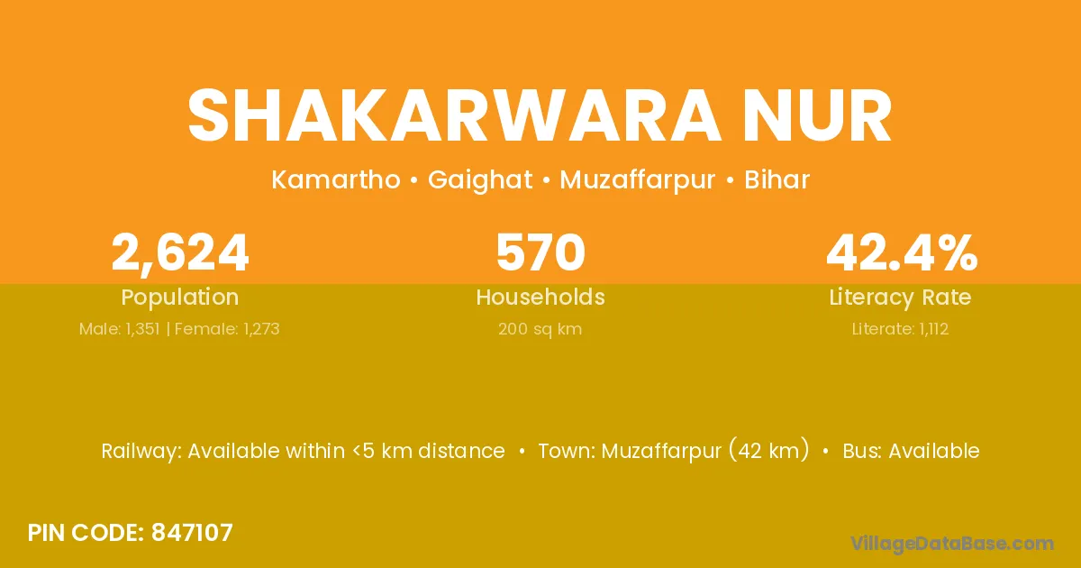 Muzaffarpur (42 km) is the nearest town to Shakarwara Nur village for major economic activities and is located approximately 42 km away.