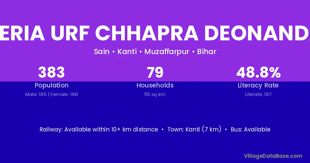 Kanti (7 km) is the nearest town to Bheria Urf Chhapra Deonandan village for major economic activities and is located approximately 7 km away.