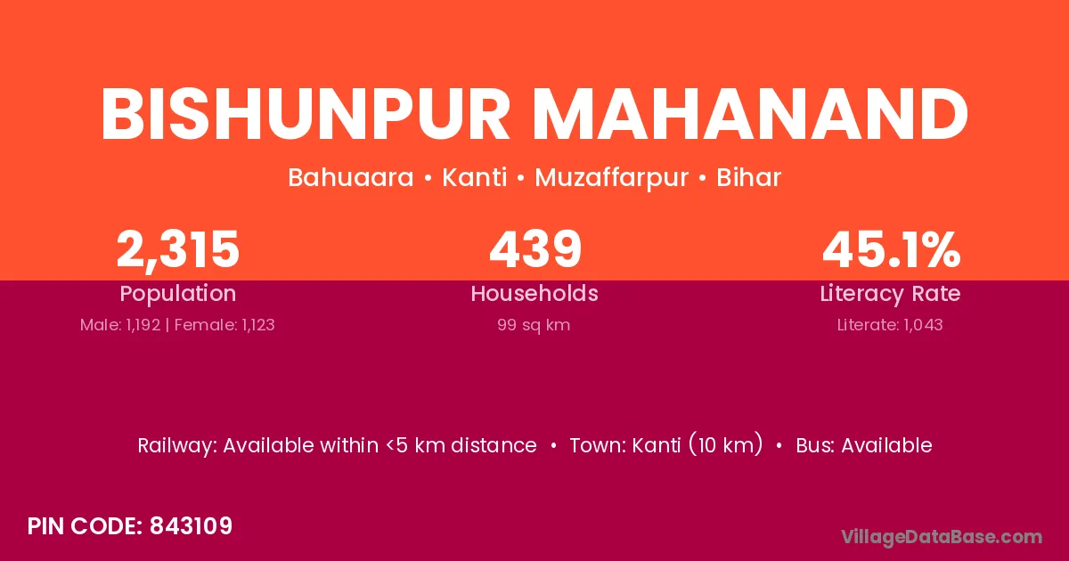 Kanti (10 km) is the nearest town to Bishunpur Mahanand village for major economic activities and is located approximately 10 km away.