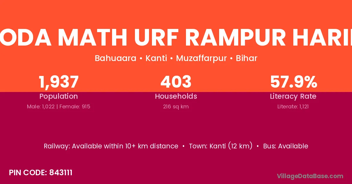 Kanti (12 km) is the nearest town to Jasoda Math Urf Rampur Harihar village for major economic activities and is located approximately 12 km away.