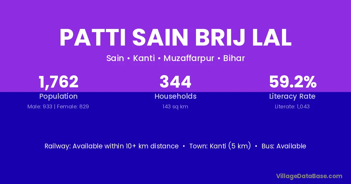 Kanti (5 km) is the nearest town to Patti Sain Brij Lal village for major economic activities and is located approximately 5 km away.