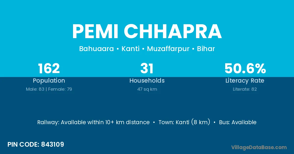 Kanti (8 km) is the nearest town to Pemi Chhapra village for major economic activities and is located approximately 8 km away.