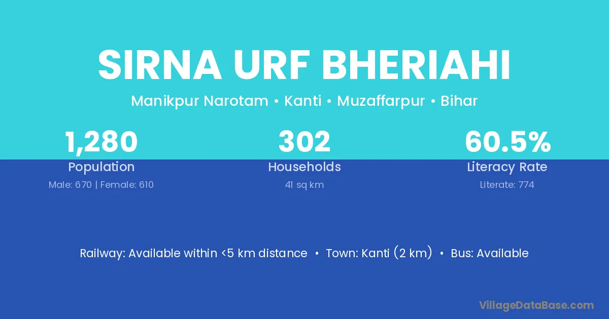 Kanti (2 km) is the nearest town to Sirna Urf Bheriahi village for major economic activities and is located approximately 2 km away.