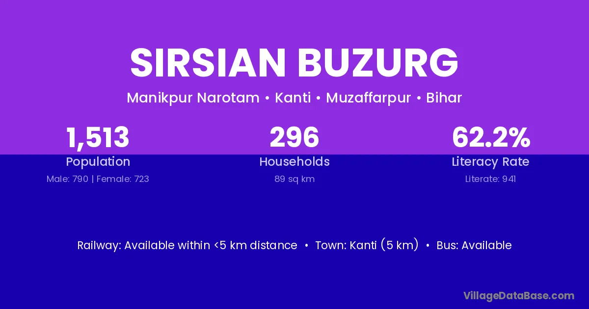 Kanti (5 km) is the nearest town to Sirsian Buzurg village for major economic activities and is located approximately 5 km away.
